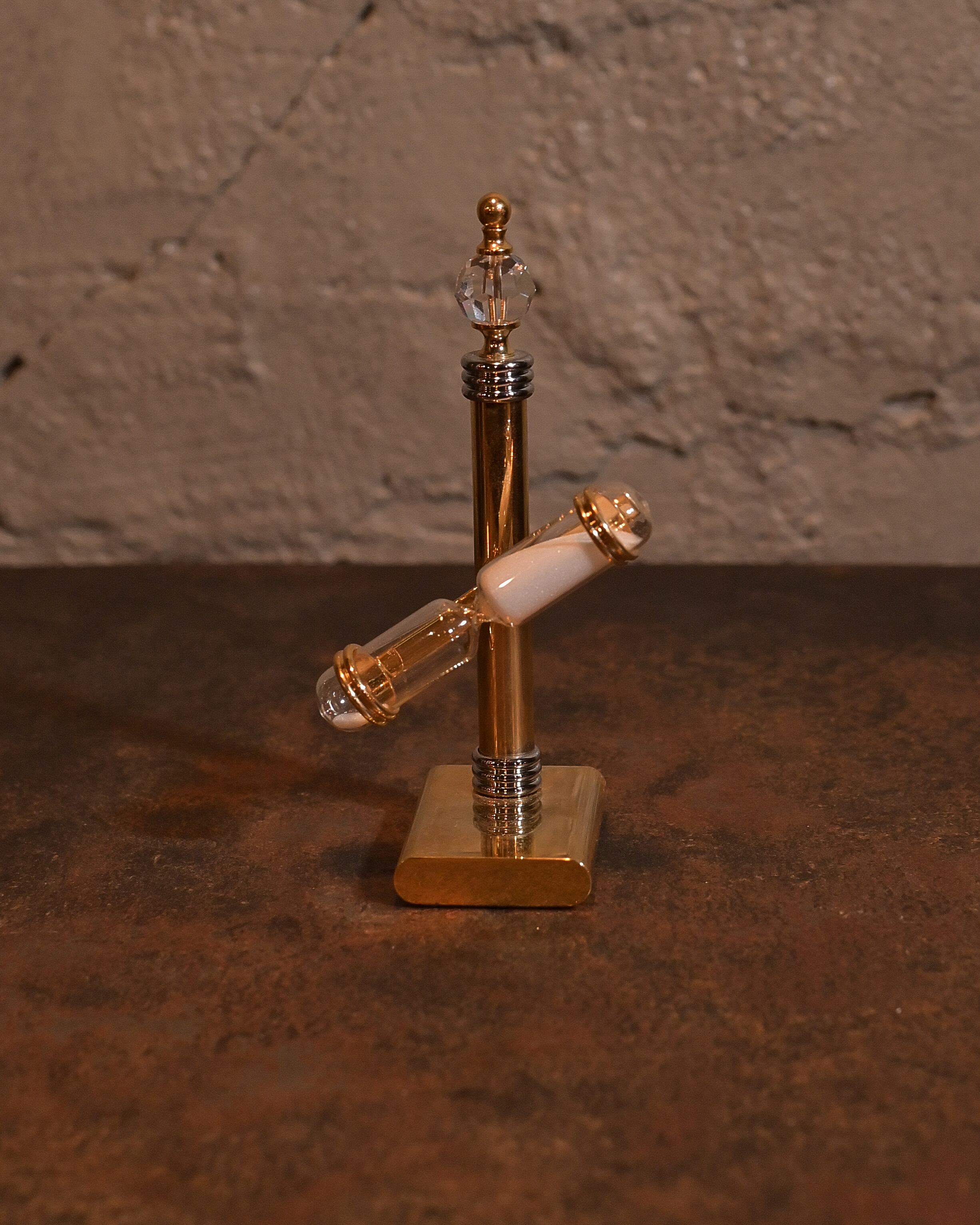 ゴールドのフレームに繊細なガラス製の砂時計が組み合わされ、上部には煌めくクリスタルがアクセントとしてあしらわれています。デスクやインテリアのアクセントにぴったりなアイテムで、クラシカルな雰囲気を演出します。