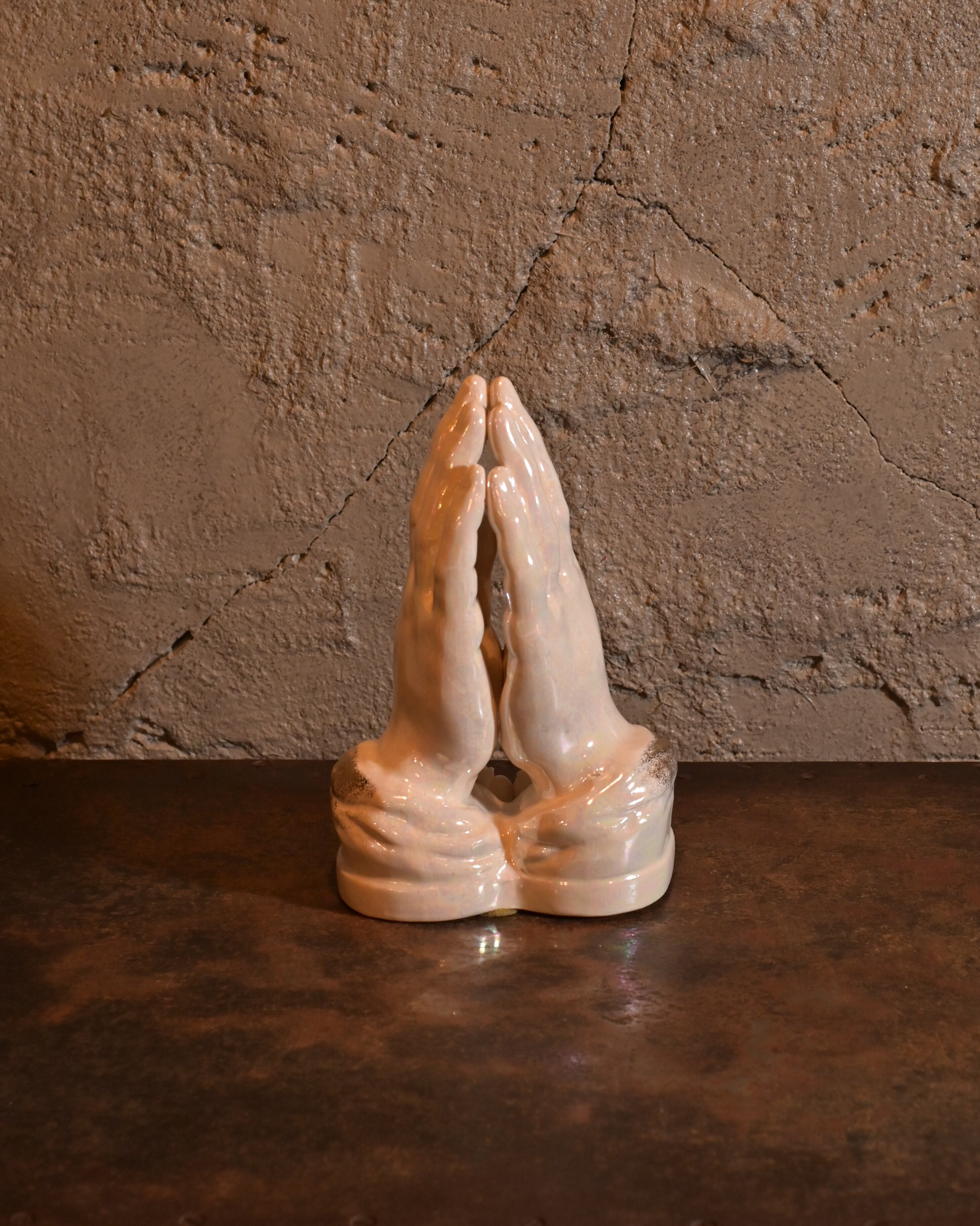 ミッドセンチュリー期に製造された、ヴィンテージの祈りの優雅な陶器製オブジェ。 パール調の光沢と繊細な造形が特徴で、静謐な祈りの雰囲気を醸し出します。